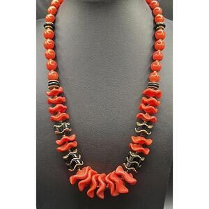 CZECH Glass Coral Pink Ruffle Black Zig Zag Graduated Bead Necklace