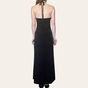 90s vintage sparkly black velvet high neck prom dress by Rampage. Maxi length with a tying halter neck and beautiful silver glitter pattern on the bodice. So flattering and the perfect whimsigoth style dress for prom! The top has a sparkling glittery floral design that trails down towards the waist in a point.