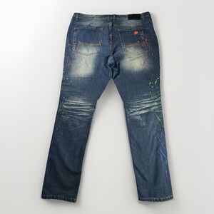 Switch Remarkable slim taper fit jeans in size 40x32. Moto biker style with ribbed knee panels, patch distressing and multicolor paint splatter accents. Heavy wash fade with stretch fabric.