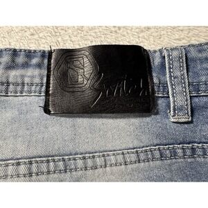 Switch Remarkable slim taper fit jeans in size 40x32. Light wash blue denim with ribbed moto knee panels, patch distressing and red/green paint splatter accents. Stretch fabric for comfort.