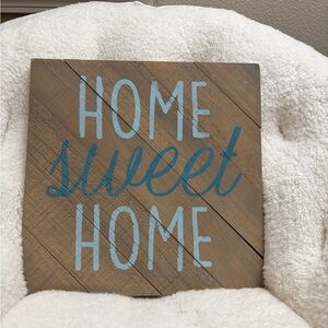 Rustic wooden sign with 'Home Sweet Home' in blue letters. Perfect for home decor.