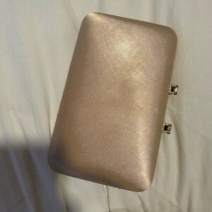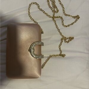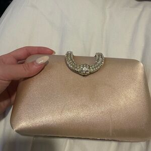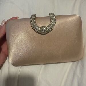 Chic champagne clutch with sparkling crystal detail. Perfect for evening events.