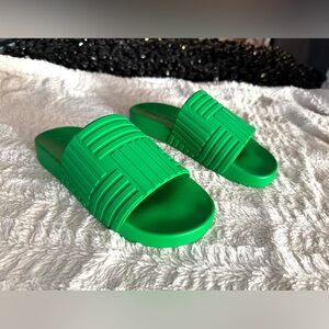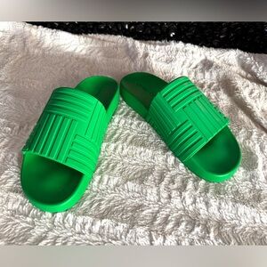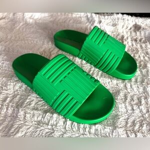 Bottega Veneta slides, bright green sandals, luxury rubber slides, designer slip-on shoes, embossed geometric pattern, vacation-ready sandals, women’s size 39, high-end casual footwear, Bottega Veneta green shoes, statement luxury sandals.