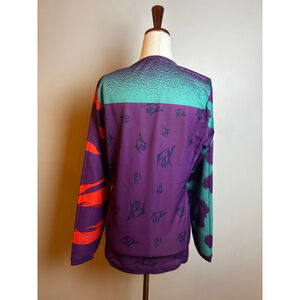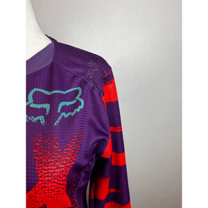 This is a pre-owned Fox long-sleeve jersey, primarily purple with a vibrant red lower front and red accents on the right sleeve. The left sleeve features a teal and purple abstract pattern. The front displays a large red Fox logo with a teal Fox head logo above it on the right chest, and "180" in teal on the left chest. The back has a teal horizontal stripe across the shoulders and scattered black Fox logos. The fabric appears to be a textured, breathable material. A tag indicates "MADE IN VIETNAM" and "STYLE#11851".