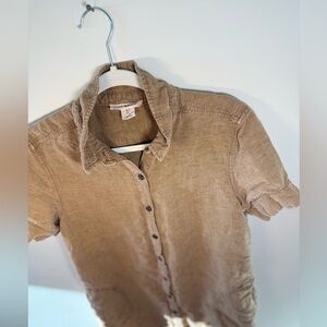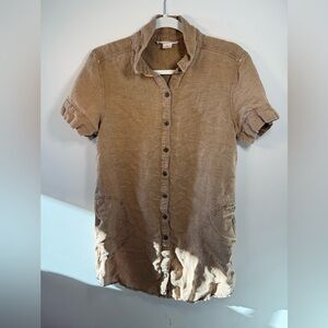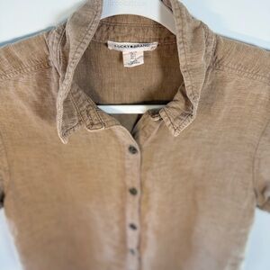 Lucky Brands Women’s brown button down dress. Women’s size Large. Stylish tan button-down shirt. Ideal for casual outings. Features short sleeves and a classic collar. This item has been fully laundered. Material is 53% Linen, 47% lyocell. The dress is a short dress fit.
