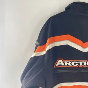 Arctic Cat A-TEX Snowmobile Pullover Jacket in Excellent Condition. Great Looking Jacket. Black / Orange Colorway. Large Arctic Cat Spellout Logo on Front and Back. Arctic Cat Cat Logos on Shoulders (One is snapped). 3M Scotchlite Reflective Piping. Fleece Lined Inner Collar. 2 Zippered Under Arm Vent Holes. 1 Zippered Back Vent Hole. 2 Zippered Front Pockets. Breathable Mesh Lining. Drawstring adjustable Waist.