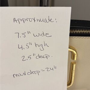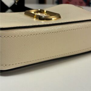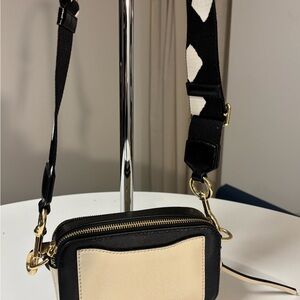 Sleek Marc Jacobs crossbody bag in cream and black. Features a bold strap and gold accents.