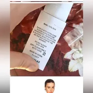 Fabric content tag is not there, garment is possibly 100% silk based on my experience (I’ve added a picture from a different listing of the same exact top)