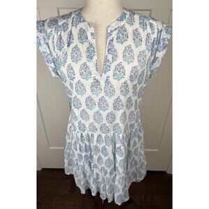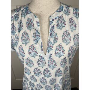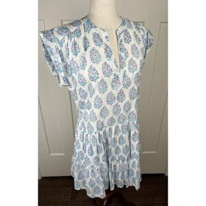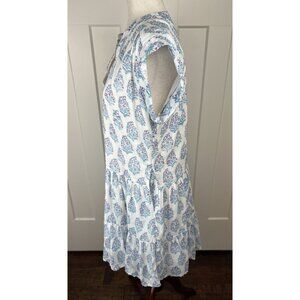 Beautiful Oliphant dress from Tuckernuck in a soft gauzy 100% cotton. Features a blue and pink block print on ivory, split neckline, cap sleeves, and a flattering drop waist with tiered skirt.
