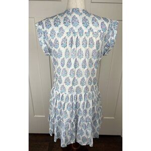 oliphant dress tuckernuck boutique block print indian cotton gauze mini dress coastal preppy resort wear hamptons nantucket palm beach tiered skirt summer vacation lightweight boho chic artisanal handmade look blue pink floral size large