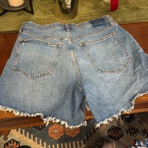 Classic light blue jean shorts with frayed edges. Ideal for casual wear.