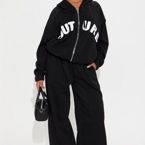 Chic black track suit with bold white lettering. Comfortable fit with a stylish edge. Perfect for casual outings.