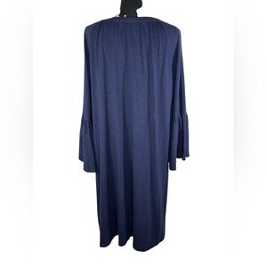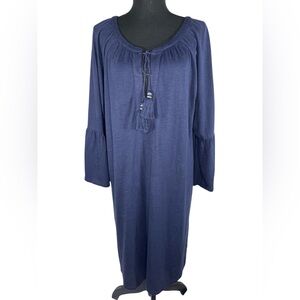 Navy blue shift dress with a relaxed fit, tasseled neckline, and flared sleeves. Soft and comfortable fabric makes it perfect for casual wear or beachside dinners.