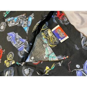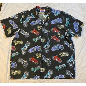 Vintage button-down shirt showcases an all-over motorcycle print in vibrant red, blue, and yellow against a solid black background. Crafted with a classic camp collar and a single chest pocket, this short-sleeve top offers a relaxed fit perfect for casual outings or themed events. The lightweight fabric ensures comfort, while the detailed graphic pattern adds a bold, retro aesthetic to any wardrobe.