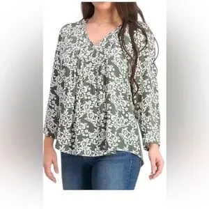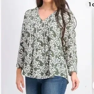 Fun2Fun Stitch Fix Maley pleated V-neck top in a green and white floral print with three-quarter sleeves. Size small. New without tags, never worn.