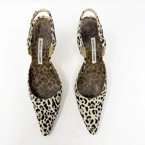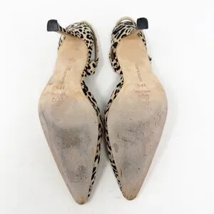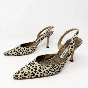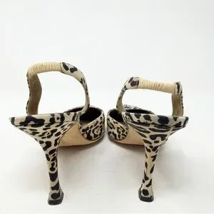 Manolo Blahnik Carolyne Leopard Print Canvas Slingback Heels Womens Size EU 38.5