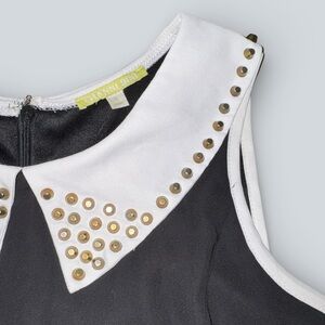 Sleeveless fit-and-flare dress featuring a white collar embellished with gold-tone studs. Flattering structured silhouette with a fitted bodice and flared skirt. Hidden back zipper closure.