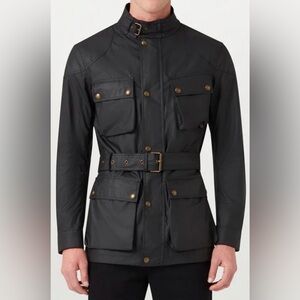 Classic black jacket with a belted waist. Features multiple pockets and brass button details. Ideal for a rugged, stylish look.