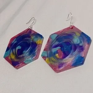 Vibrant hexagon earrings with a swirl of colors. Handcrafted design. Perfect for adding a pop of color. sterling silver ear wires