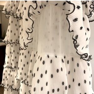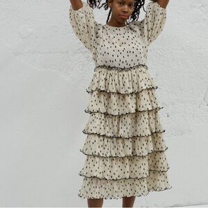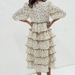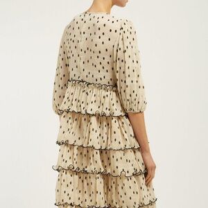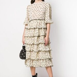 GANNI Lowell Tiered Polka Dot Plisse Beige & Black Midi Dress conservative pleat