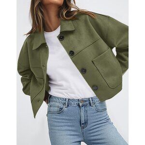 Women's Army Green Faux Suede Cropped Jacket Casual Lightweight Fall Fashion