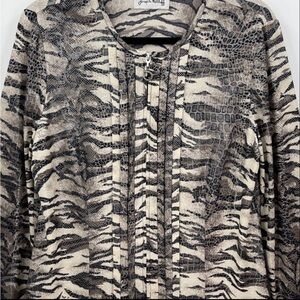 Discover the stunning animal print jacket designed by JOSEPH RIBKOFF! Featuring a zippered closure adorned with a striking snake detail pull, this piece radiates style. The metallic print adds a touch of glamour throughout. Made from 92% polyester and 8% spandex, it offers a comfortable fit. While there is no size tag, it is generously sized as a medium based on measurements. Approximate dimensions are as follows: 20” across the chest and a length of 23.5”. Embrace a fashion statement that will elevate your wardrobe.