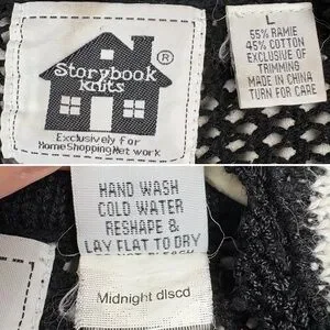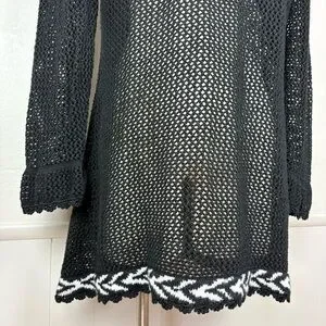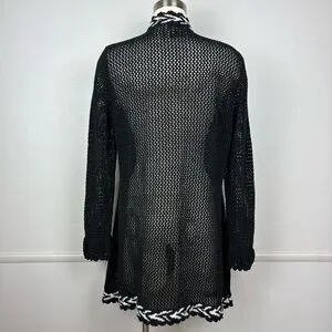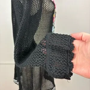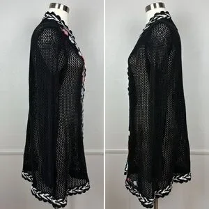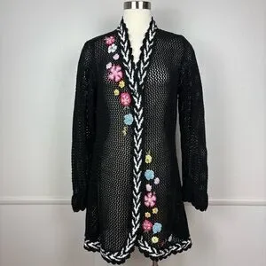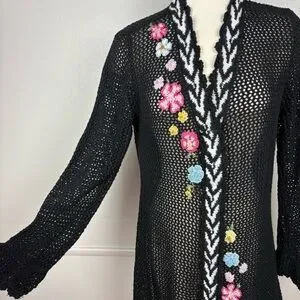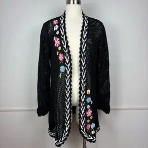 Storybook Knits Vintage Black Cardigan Size L Longline Beaded Floral Open Knit