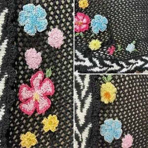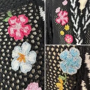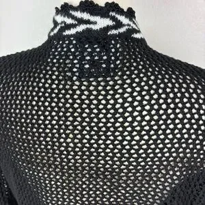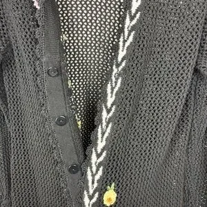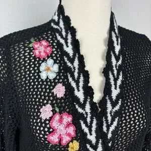 Vintage cardigan features an open knit in black with white chevron patterning on the front opening and hem. Extensive knitted or crocheted flower accents with beading adorn the front of the sweater, starting on the right side and trailing down to end on the left side. Invisible button front closure with large black buttons on the interior so the trailing flowers are uninterrupted when buttoned. Long sleeves have ruffled cuffs with scalloped lace edging. This scalloped lace edging also continues along front opening and neckline.