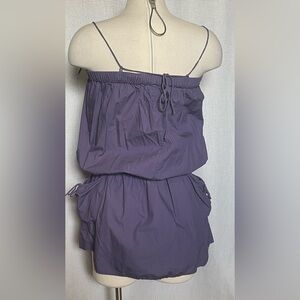 Purple. Elastic at top and waist. Adjustable straps at shoulders. Self tie waist for perfect fit. Pockets on both sides. Super cute alone or wear as beach/pool coverup
