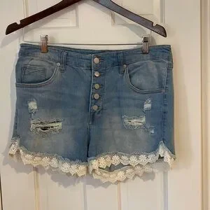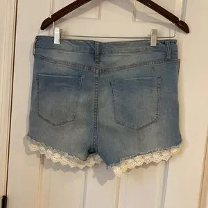 Mossimo high rise ripped Jean shorts with lace trim details. Size 14/32