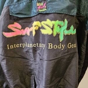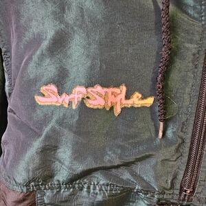 Jump straight back to the 90's in this iridescent green and black windbreaker with neon Surf Style accents and velcro front pocket. It's in great condition with nery minimal cracking of the lettering for its age. One Size Fits All on the tag...it is quite big with the chest measuring 26" flat.