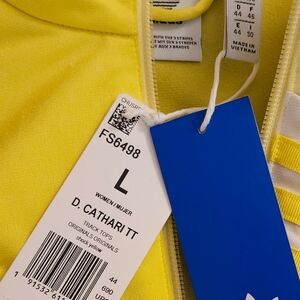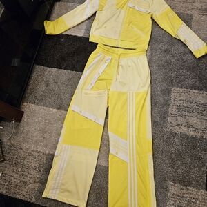 Vibrant yellow track suit with white accents. Includes jacket and pants. Stylish and sporty design. pant is in a size M and fit true to size and the top is in a size L because it runs small and does not stretch