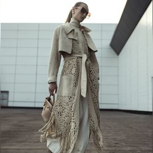 Papyrus Yani layered crochet coat from JONATHAN SIMKHAI featuring layered design, crochet panelling, fringed edge, classic collar, belted waist, long sleeves, buttoned cuffs, two side patch pockets and long length.
