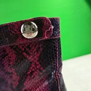 Step into unapologetic glam with these purple snakeskin stiletto heels from Apple Bottoms. Featuring an open toe, strappy front, and side zipper with metallic button detail, these heels bring instant edge and attitude to any outfit. Perfect for club nights, bold shoots, or statement styling.