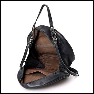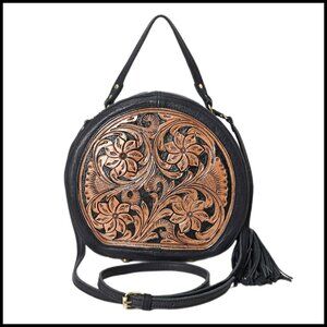 A beautifully handcrafted crossbody bag with a unique canteen shape and intricate tooled design. Features an antique dye finish and a fully adjustable, detachable leather strap for versatile wear.