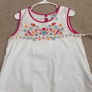 A charming Disney sleeveless top featuring delightful floral embroidery. This white top is adorned with a colorful array of embroidered flowers across the chest, including a hidden Mickey Mouse head. The design is complemented by a vibrant pink trim around the neckline and armholes, adding a playful touch to the garment. Has a cute keyhole back and is in great pre-owned condition (worn maybe twice). See photos for wear and measurements. Smoke and pet free home.