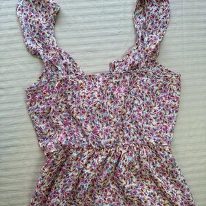 Chic high low dress with floral pattern. Features ruffle details and a flattering silhouette. Ideal for versatile styling.