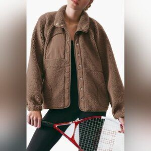 A jacket crafted from high-pile fleece features a woven placket and trim for a contrasting look.