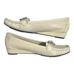 Stuart Weitzman Cream Leather Perforated Loafers Buckle Detail Slip On Size 8.5