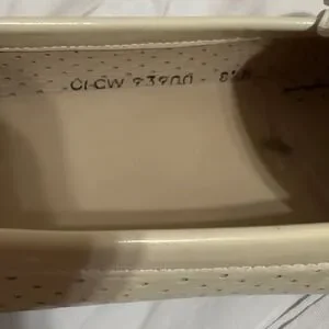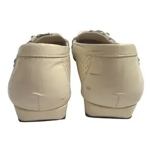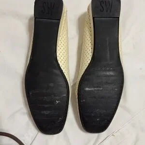 Stuart Weitzman loafers cream colored leather classic loafer perforated design stylish buckle accent Some scuffing that can be buffed out. Also some adhesive residue from sole pads I had put on and removed for sale. Also can be easily removed