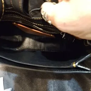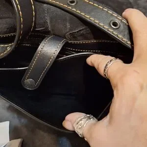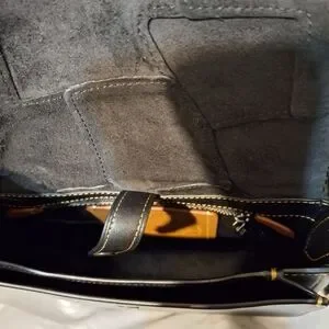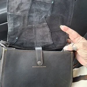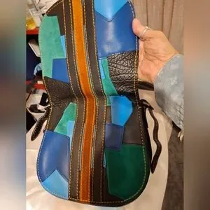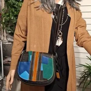 This Coach crossbody bag features a striking black and blue color-block pattern, blending modern aesthetics with a classic saddle shape. Crafted from high-quality leather, it includes an adjustable shoulder strap and metallic accents, making it a stylish and functional accessory for any occasion.