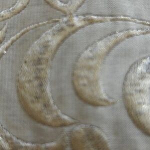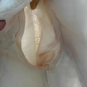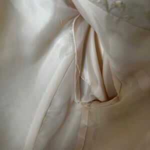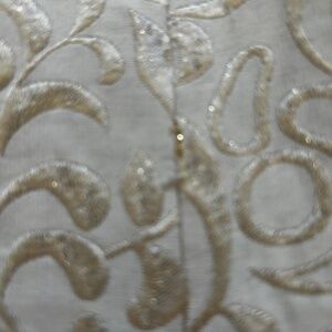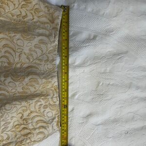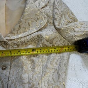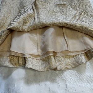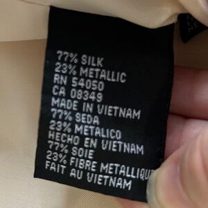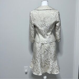Size 8P Skirt set. No rip or tears in lining or on the set. 77% Silk and 23% Metallic. The set is dry clean only. There are a few flaws as seen in the last two photos. These are not the only two flaws. This type of flaw is in a few other spots due to the wear and age of the item. Overall these flaws are not that noticeable as it blends into the design of the brocade fabric.