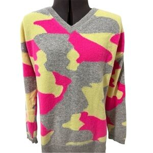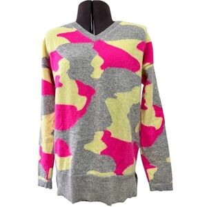 Pure Amici 100% Cashmere Bright Camo Print V Neck Sweater Size XS