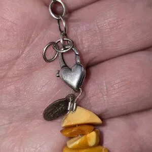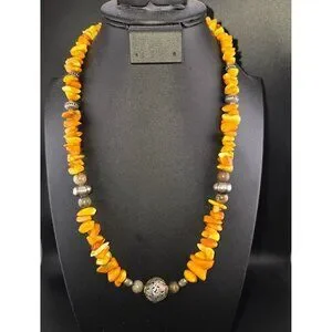 This necklace features vibrant natural amber stones paired with sterling silver beads, creating an earthy yet elegant aesthetic. The heart-shaped clasp adds a touch of charm, while the adjustable length ensures a perfect fit for various occasions. Designed by Veronica, this piece combines artisanal craftsmanship with timeless style.