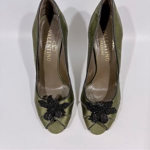Valentino Garavani Green Black Florak Rhinestone Peep Toe Heels 39 Whimsigoth