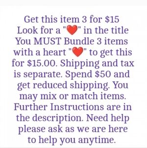 This item has a heart ❤️ therefore you can get this item for 3/$15 BUT you must add 3 listings to a bundle. It doesn't have to be the same item. You can mix or match items especially if we have only 1 available as long as the title has a heart ❤️ in it. If you don't add 3 items to a bundle you'll receive 1 item no ifs ands or buts.