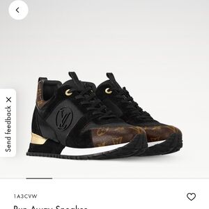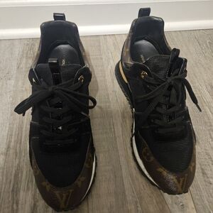 Elegant black sneakers with gold accents. Features signature Louis Vuitton design. Stylish and comfortable.