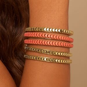 Elevate your wrist game with this stunning set of 5 Gold-tone and salmon-pink bangle Bracelets for women. These bracelets are designed to add a touch of elegance and color to your ensemble. They have a standard 7-inch size, making them a versatile accessory.