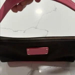 Stylish shoulder bag with pink accents. Features a brown body. Perfect for everyday use.