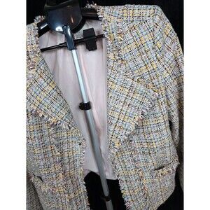 Elegant and timeless, this LOFT bouclé tweed jacket is a polished layering piece with soft spring appeal. Woven in a cream base with pink and blue threads and subtle metallic accents, it adds texture and light without feeling heavy. The open-front silhouette, softly frayed trim, and classic patch pockets give it an elevated, Chanel-inspired look that works beautifully for work, brunch, or dressy casual styling.